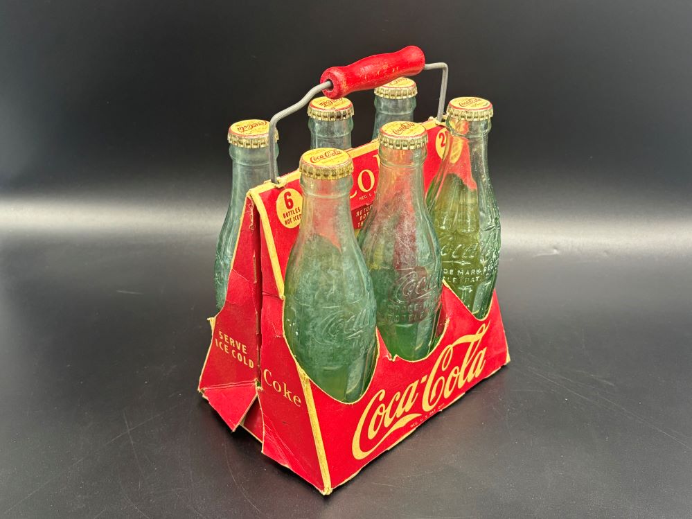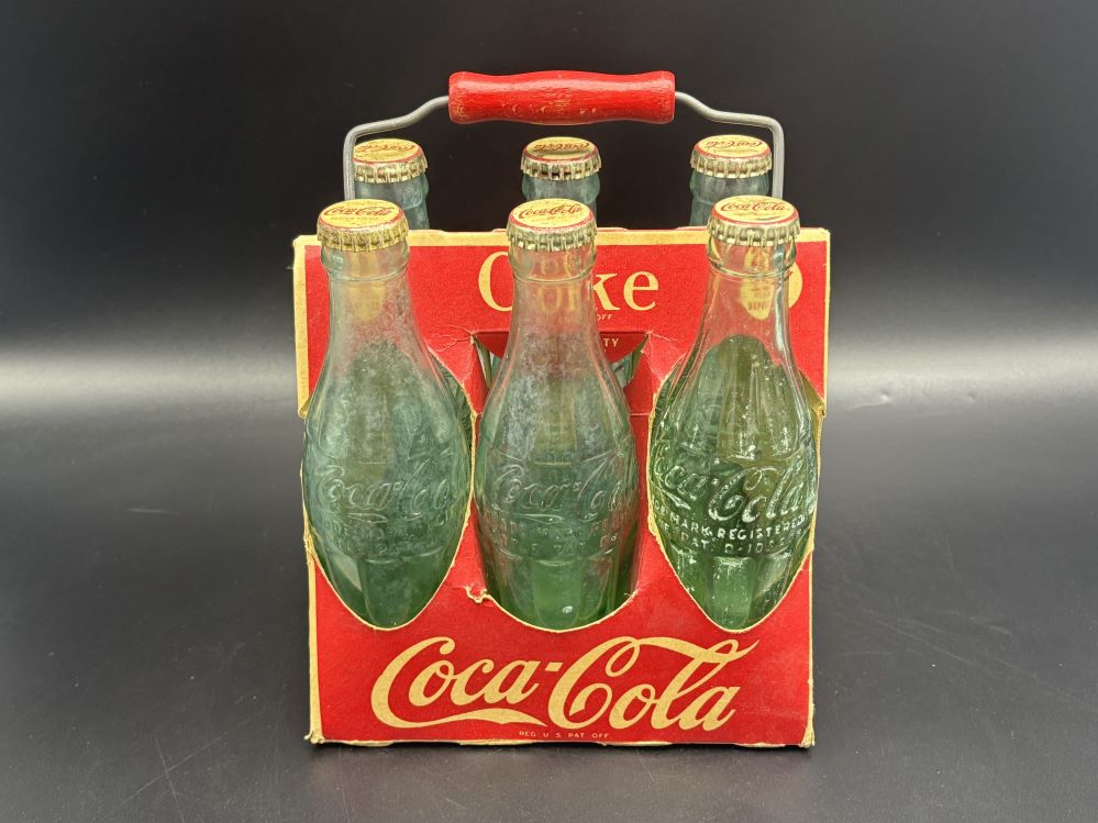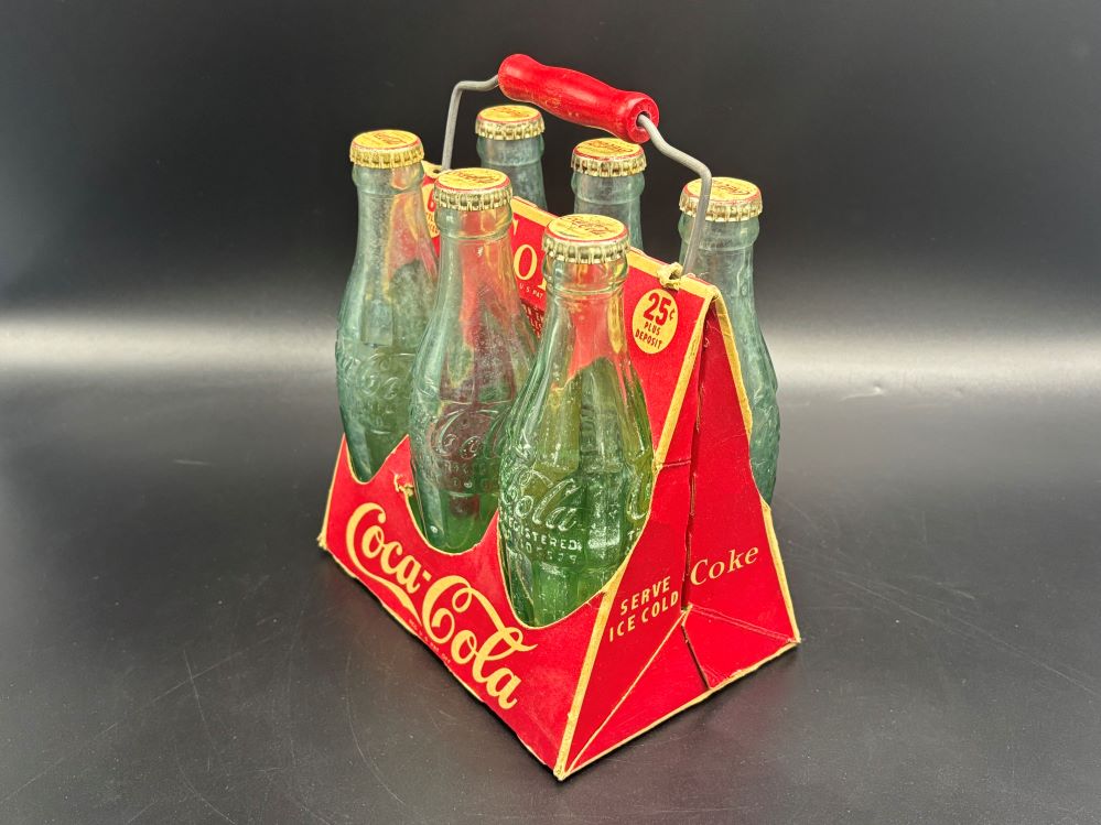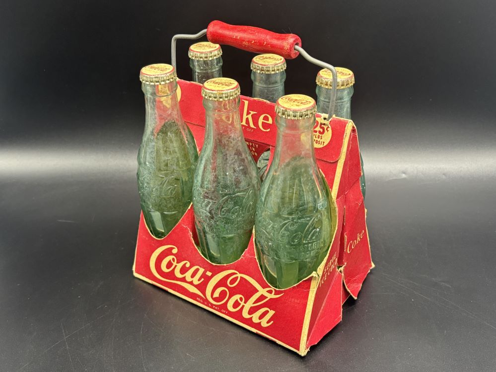Crates & Carriers « Back to OverviewCoca-Cola / 6 Pack Cardboard Carrier / With Wooden Handle Category: Crates & CarriersCountry:USAYear:1940sCapacity:18,5 x 13 x 23 cmDescription:Patent D-105529 6 FL. OZS bottles, 5 bottle 1945, 1 bottle 1949 « Back to OverviewCoca-Cola / 6 Pack Cardboard Carrier / With Wooden Handle Category: Crates & CarriersCountry:USAYear:1940sCapacity:18,5 x 13 x 23 cmDescription:Patent D-105529 6 FL. OZS bottles, 5 bottle 1945, 1 bottle 1949