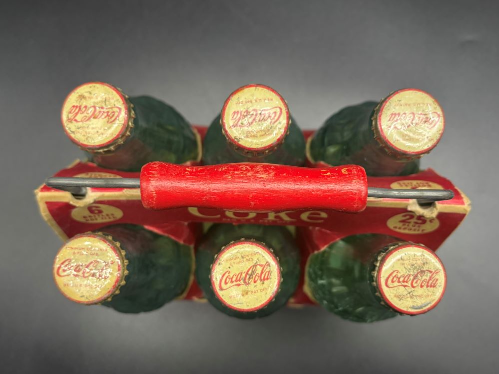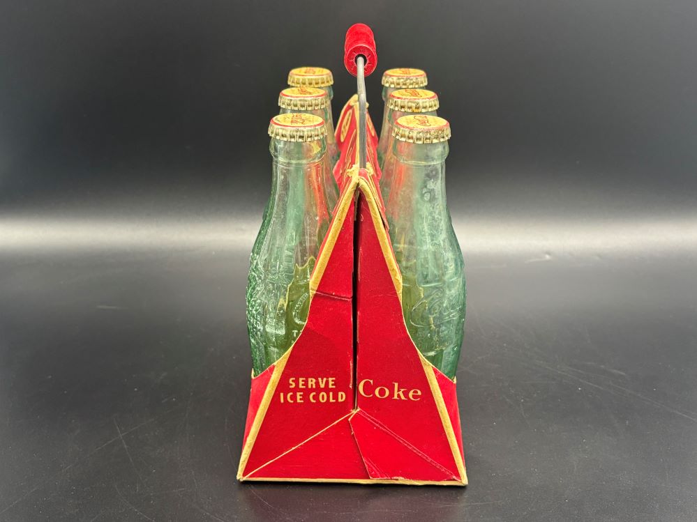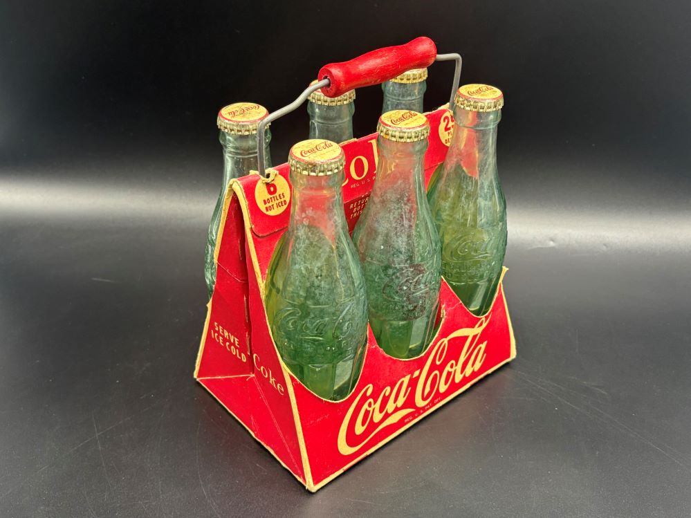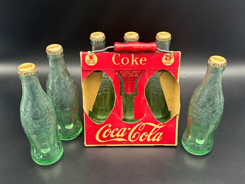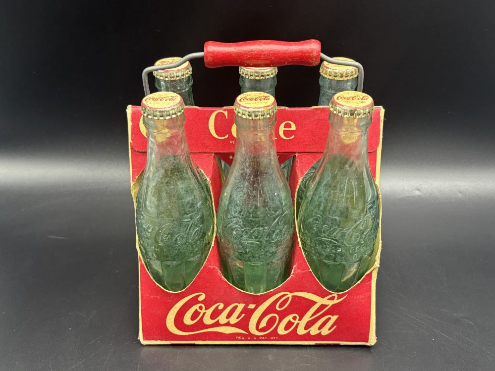 Crates & Carriers « Back to OverviewCoca-Cola / 6 Pack Cardboard Carrier / With Wooden Handle Category: Crates & CarriersCountry:USAYear:1940sCapacity:18,5 x 13 x 23 cmDescription:Patent D-105529 6 FL. OZS bottles, 5 bottle 1945, 1 bottle 1949 « Back to OverviewCoca-Cola / 6 Pack Cardboard Carrier / With Wooden Handle Category: Crates & CarriersCountry:USAYear:1940sCapacity:18,5 x 13 x 23 cmDescription:Patent D-105529 6 FL. OZS bottles, 5 bottle 1945, 1 bottle 1949