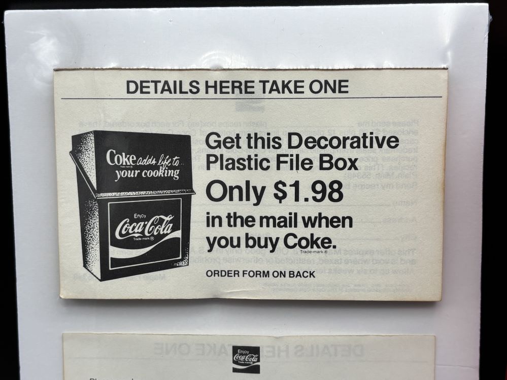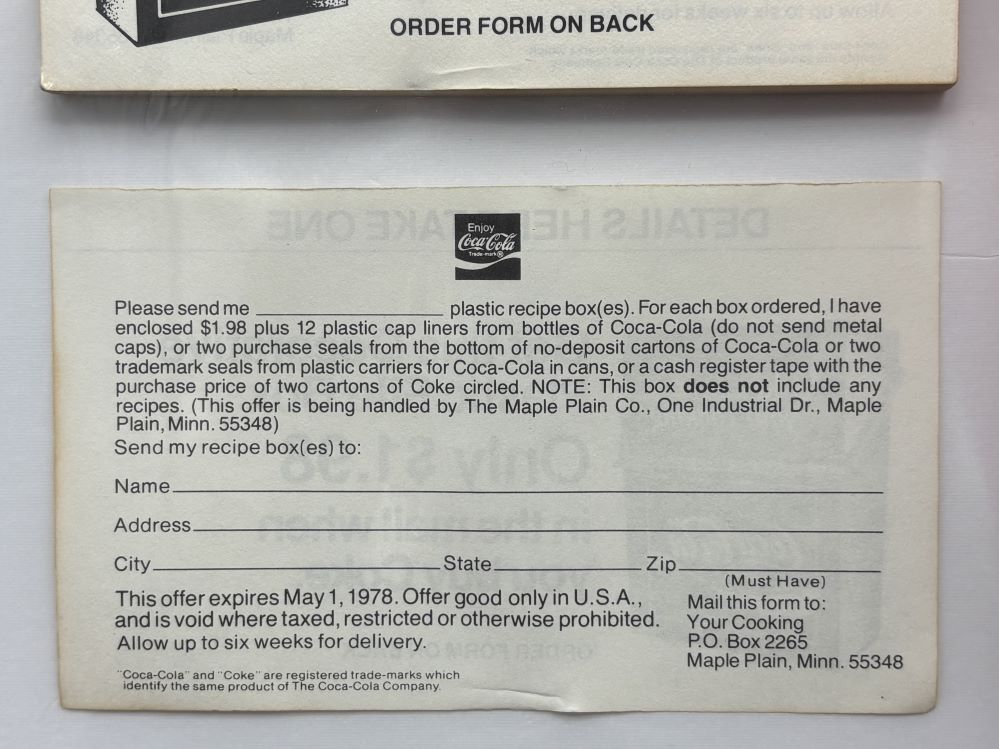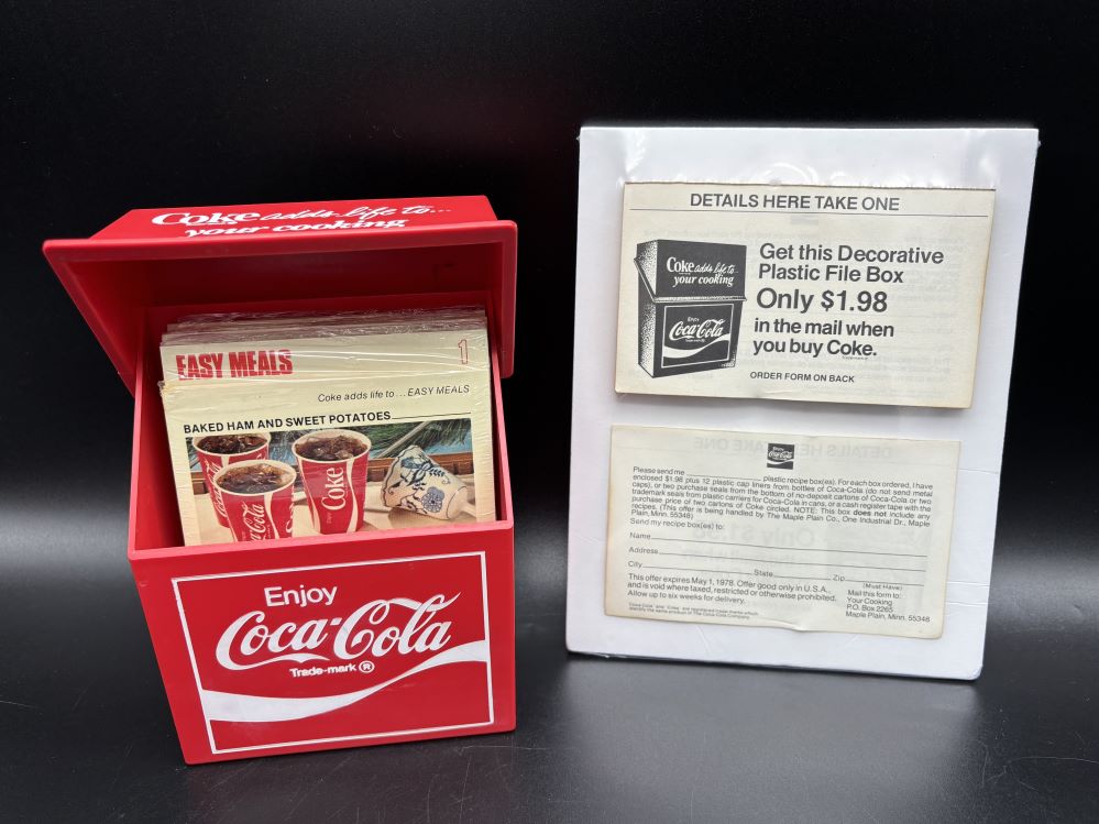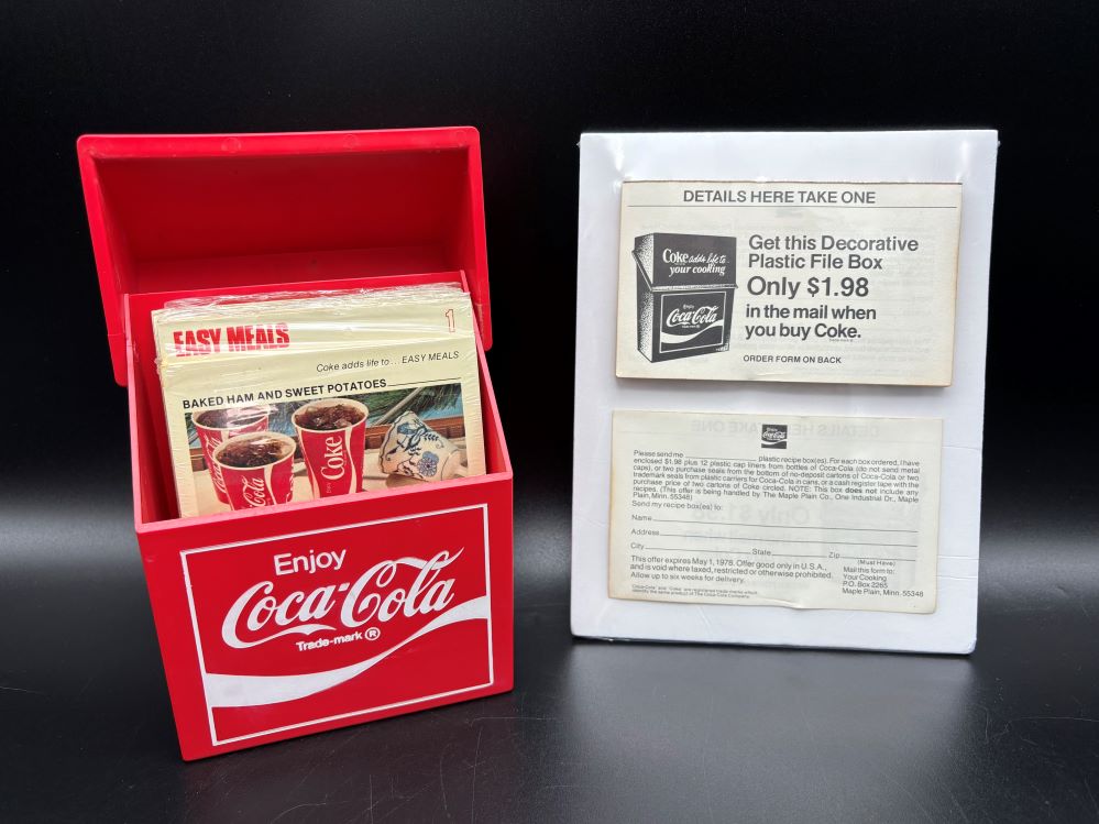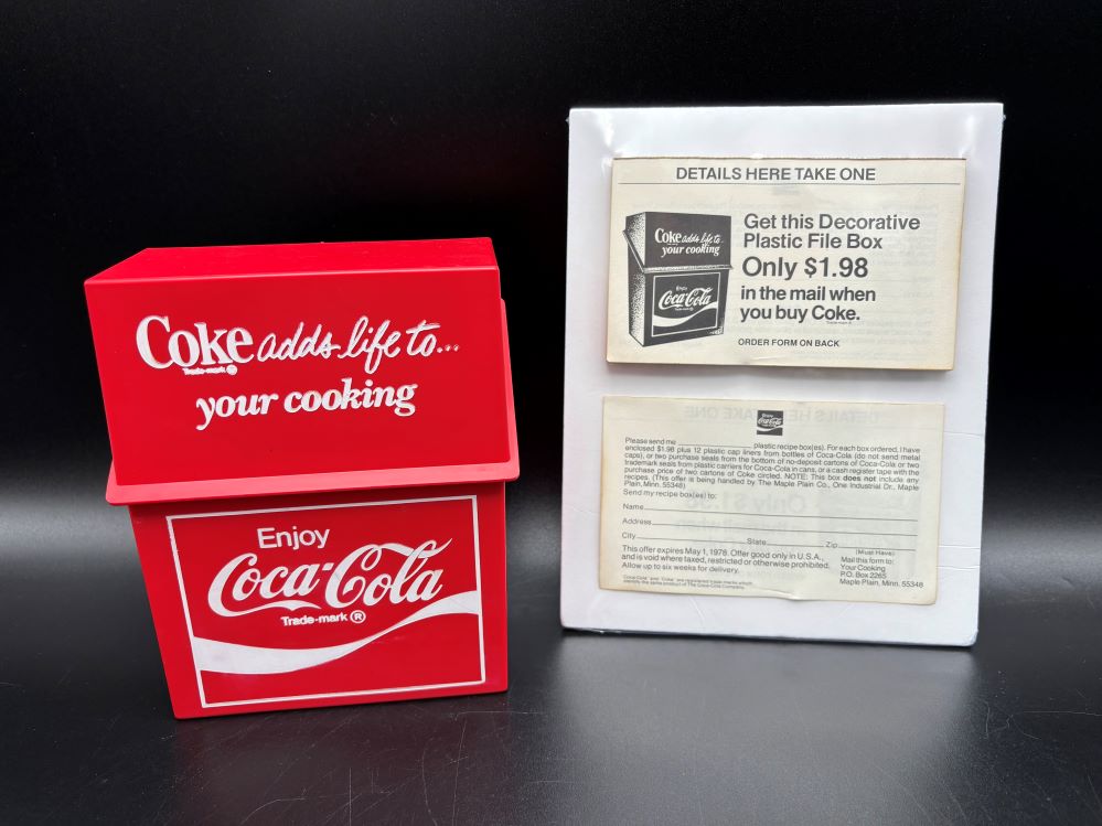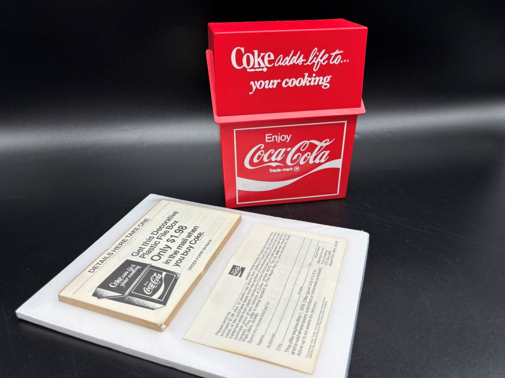 Kitchen Items « Back to OverviewCoca-Cola / Recipe Plastic Box & Order Forms Pad Category: Kitchen ItemsCountry:USAYear:1978Capacity:15 x 12,5 x 6,3 cm « Back to OverviewCoca-Cola / Recipe Plastic Box & Order Forms Pad Category: Kitchen ItemsCountry:USAYear:1978Capacity:15 x 12,5 x 6,3 cm